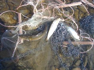 *網を張り終えて、2〜3度竿で水面を叩いたら、すぐに網を上げること。目に合わない鮎が戻ってしまうから。